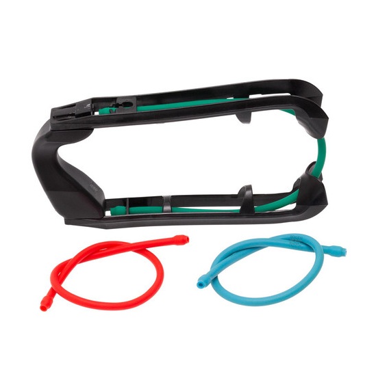 Ein Krafttrainingsgerät mit einem Bogengriff und drei unterschiedlich starken Gummibändern.